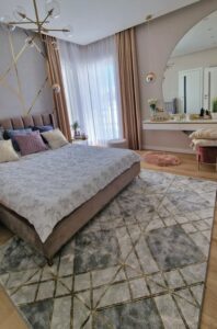 Styl Japandi to połączenie minimalizmu japońskiego i ciepła nordyckiej prostoty. Meble są lekkie, naturalne materiały dominują, kolory to stonowane tonacje ziemi i drewna. Dywan w tym wnętrzu nie ma być głównym bohaterem, a ma być cichym wspólnikiem. Zwykle wybiera się modele jednolite lub delikatnie fakturowane, w beżach, jasnej szarości, kremie, czasem miękkiej oliwce. Tekstura nie może być przesadnie puszysta, ale subtelna. Dywany do sypialni w stylu Japandi wyróżnia płaskie tkanie, wełna lub naturalne włókno. Możesz też postawić na lekko wyższy runo, jeśli chcesz dodać miękkości stopy. W sypialni dywan w stylu Japandi będzie strefą wyciszenia, miękką granicą między łóżkiem a resztą podłogi. W salonie – przestrzenią, która łączy strefę odpoczynku z kuchnią, ale bez dramatycznego akcentu tekstylnego.